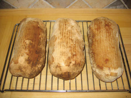 ![]() 30-dec-2005: ...and three mid-sized loaves. All loaves were baked after essentially a normal pizza firing (i.e. about 2 hours), after which the oven was left closed for half an hour. |