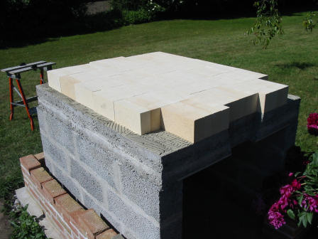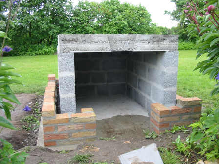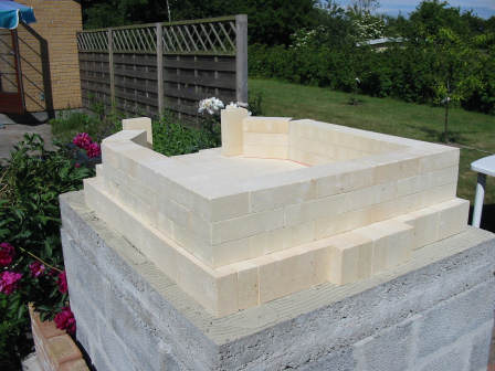![]() 30-jun-2005: The side walls are placed on top of the hearth bricks without mortar. Small deviation from Rado's design in the back corners - I find this layout easier and better. |