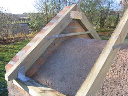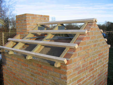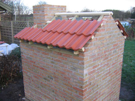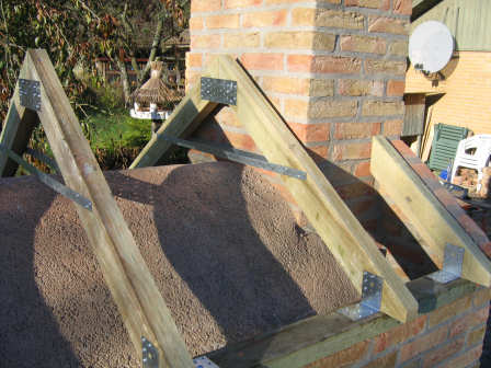 ![]() 20-nov-2005: 50x100 mm lumber is screwed to the top of the brick wall and rafters of the same dimension are nailed to it. |
