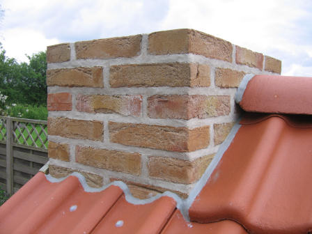 ![]() May-2006: The joints between the roof tiles and the chimney are filled with an elastic construction sealant. (It was too cold for this job when the roof tiles were laid.) |