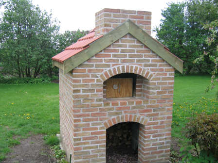 ![]() May-2006: Finally the last brick is laid and about an hour later the template is removed. The oven is finished! :-) |