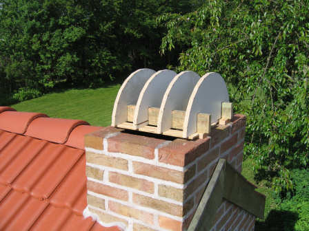 ![]() May-2006: A template is placed on top of the chimney to prepare a brick arch cover. The template rests on four small pieces of wood so that it can easily be removed when the arch is finished. |