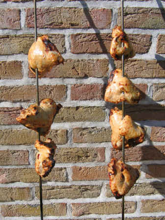 ![]() The skewers were 'wowen' up and down through the thighs to prevent them from sliding down - hopefully... |