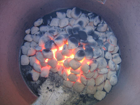 ![]() So far I have used charcoal briquettes to fire the tandoor oven. I fill a grillcoal starter and place it the center of the tandoor. When all coals are glowing, I pour them out on the bottom and add some more briquettes. |