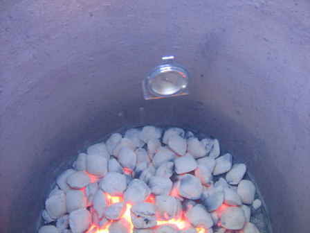 ![]() The lid (supplied with the original tandoor pot) is great for controlling the temperature. In the initial phase the oven is completely open, but during the heat-up period the opening is partially covered. |
