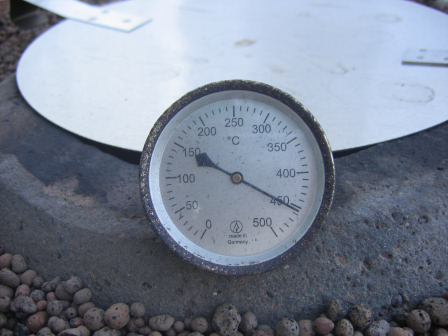 ![]() I measure the temperature with a thermometer suspended halfway down the oven. After about 1½ hour the temperature is above 300°C (570°F) and the oven is ready for cooking. |